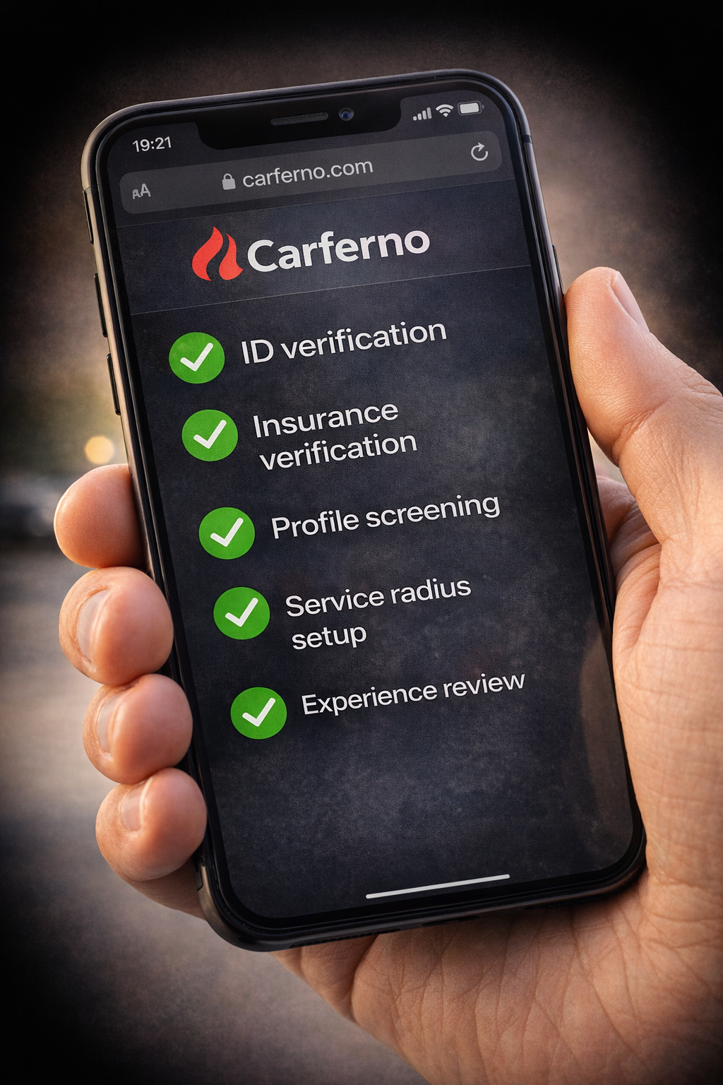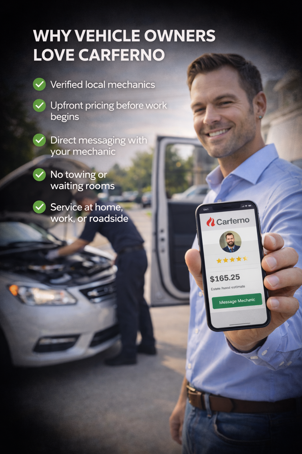 Carferno connects you with verified mobile mechanics in your area — delivering professional auto repair right to your driveway, workplace, or wherever your car breaks down. Skip the towing fees, skip the dealership pressure, and skip the shop waiting rooms. Get transparent quotes, real reviews, and real results — all from certified techs you can trust. Think of it as The Uber of Mobile Mechanics…
